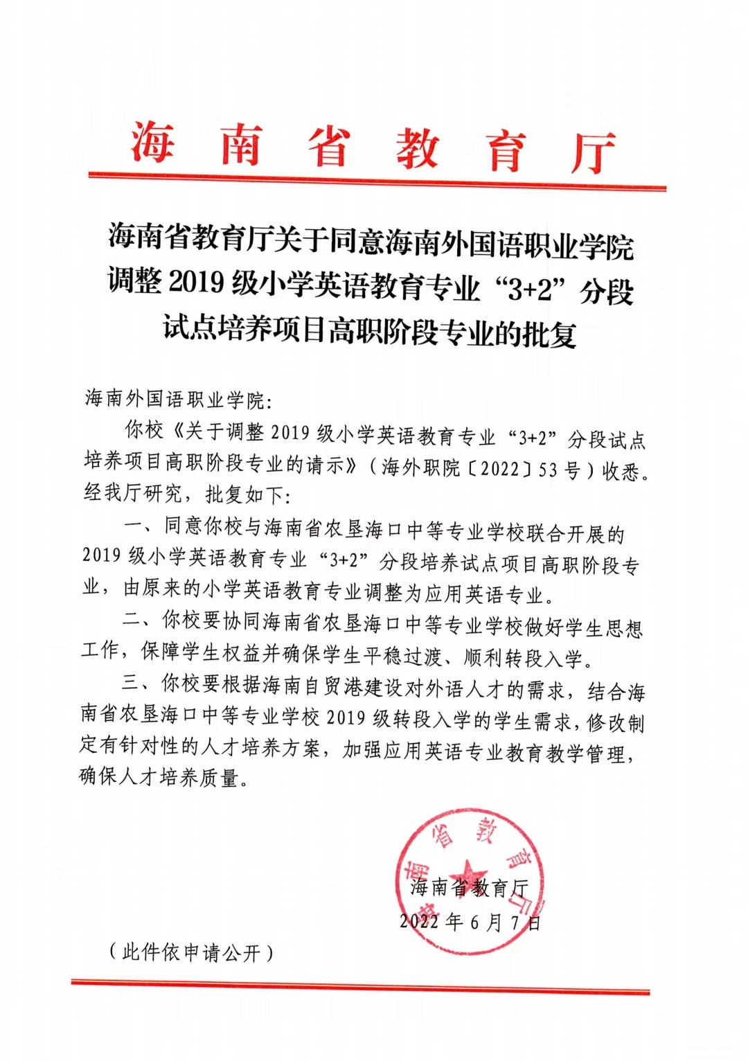 海南省教育厅关于同意开云kaiyun登录入口调整2019级小学英语教育专业“3+2”分段试点培养项目高职阶段专业的批复