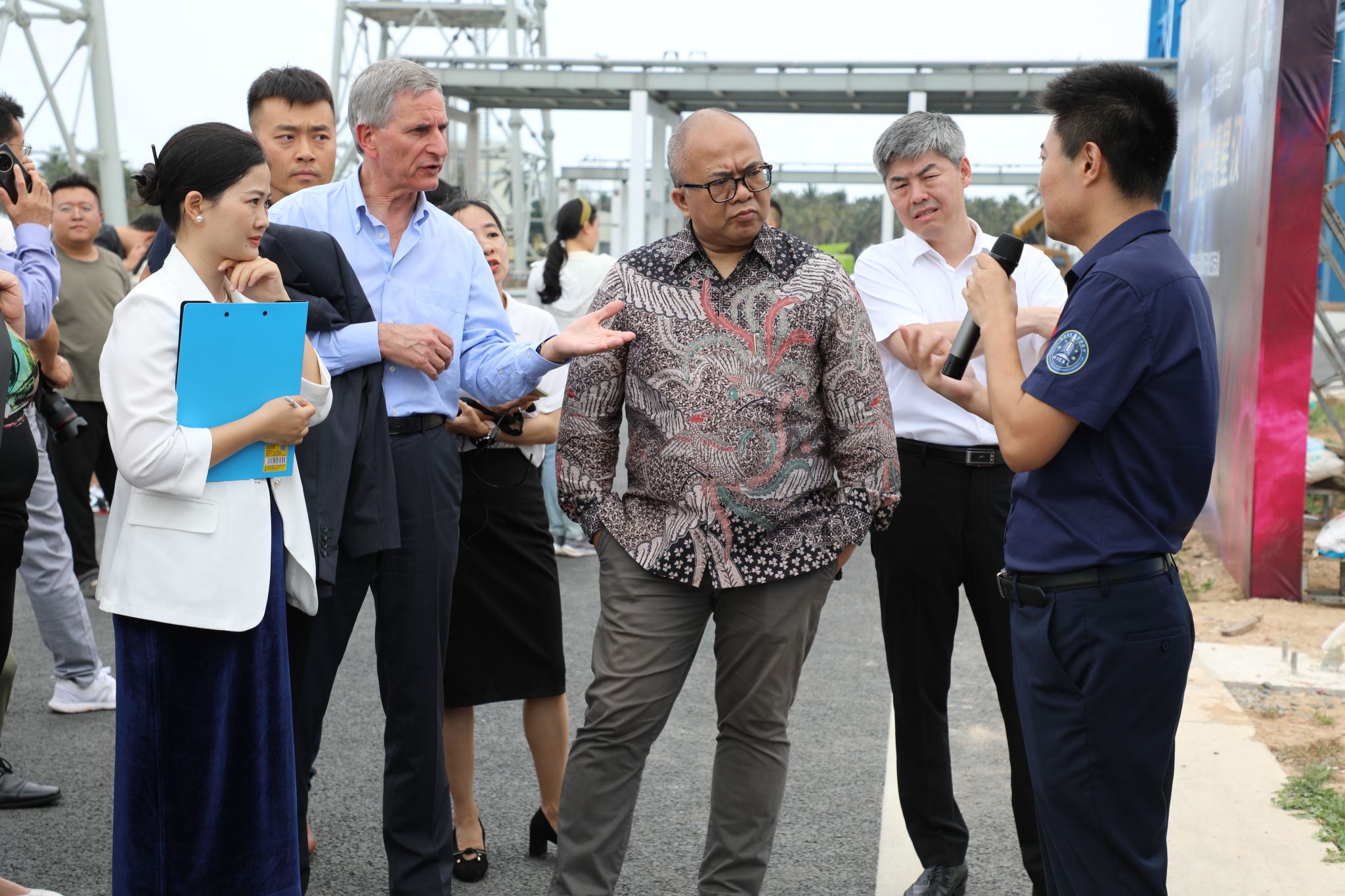 23日下午,使节团走进了正在建设中的海南国际商业航天发射中心现场,参观已经竣工的一号发射工位,并从不同角度拍摄高耸入云的发射塔架。相关工作人员为使节讲解了发射塔的构造,不少使节围上前问出心中的好奇。