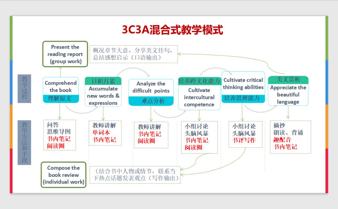 英语阅读课以通识教育理论为基础,以英文经典名著为文本,鼓励学生在人物、故事、语言、文化等元素中深度思考,深刻领悟经典的精神内涵,克服泛娱乐化的消遣主义和享乐主义。经过两年多的实践探索,孙博老师逐步总结出高职英语阅读课程的3C3A混合式教学模式。3C分别指Comprehend the text(理解文本)、Cultivate intercultural competence(培养跨文化能力)和Cultivate critical thinking abilities(培养思辨能力);3A指Accumulate new words & expressions(日积月累)、Analyze the difficult points(难点分析)和Appreciate the beautiful language(美文赏析)。除了上述6个教学环节,学生还需要完成课前的阅读报告(口语输出)和课后的书评写作(写作输出)。线上环节主要利用外研阅读平台的书内笔记、阅读圈、查词、中英切换等线上功能培养学生的自主学习能力,帮助线下教学有的放矢;线下授课环节着重检验对文本的理解程度、对难点的分析解读、培养跨文化能力、思辨能力和美文鉴赏能力。