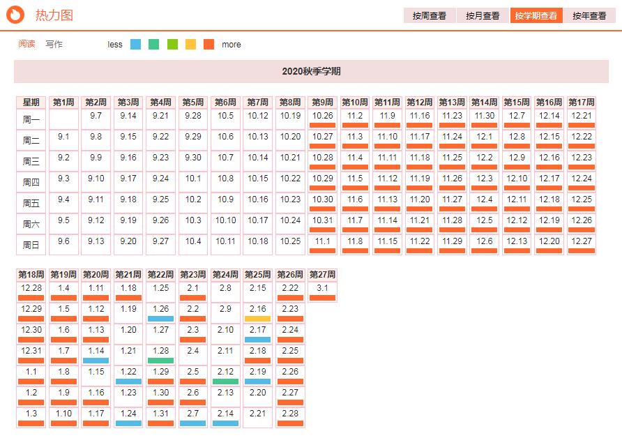 △班级阅读热力图(颜色越深,代表每天读书的人越多)