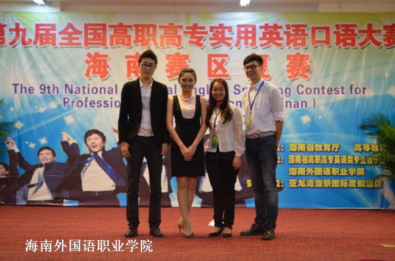 第九届全国高职高专实用英语口语大赛海南赛区主持人来自我系11涉外事务1班多鹤轩(左一)和10(1)班符小敏(左二)