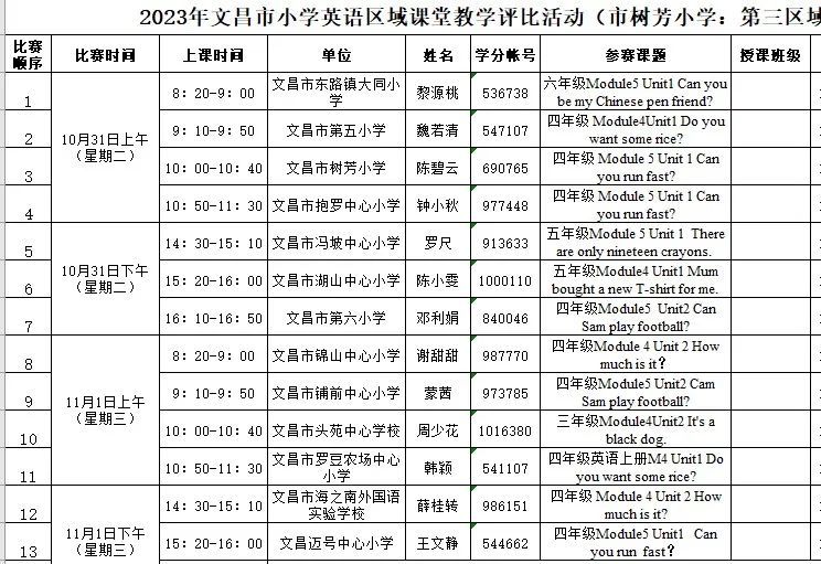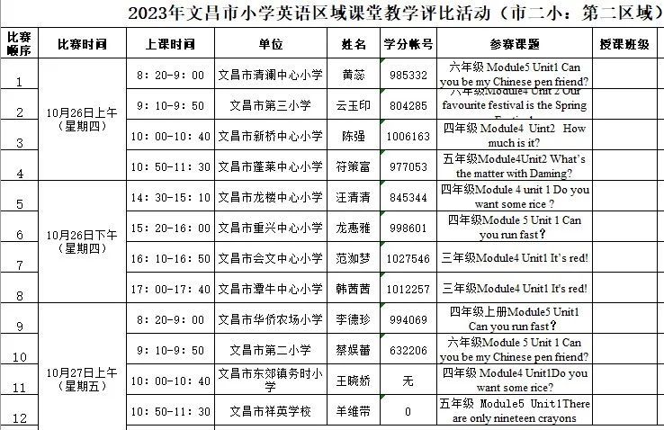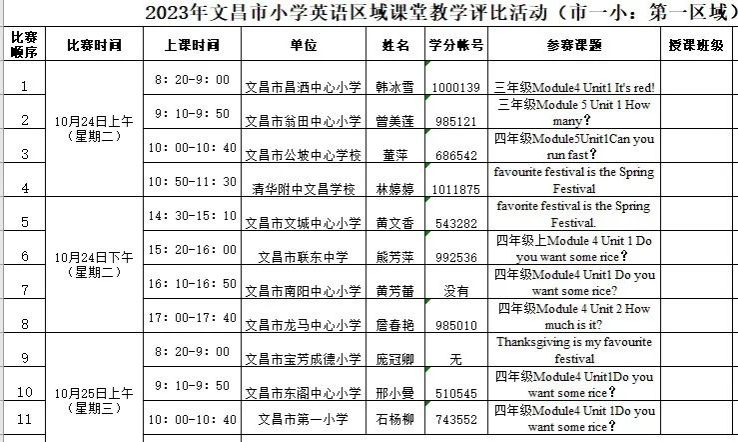 为了使英语学院小学英语教育专业学生更好地学习小学英语新课程标准,学习小学英语课堂教学设计与课堂教学活动的开展与实施,提高小学英语教育专业人才培养质量,英语学院组织376名小学英语教育专业学生于10月24日-11月1日分别到文昌市第一小学、文昌市第二小学和文昌市树芳小学参加2023年文昌市小学英语区域课堂教学评比活动现场观摩,带队老师有郑一新、李萍、陈春妮和苟春花。