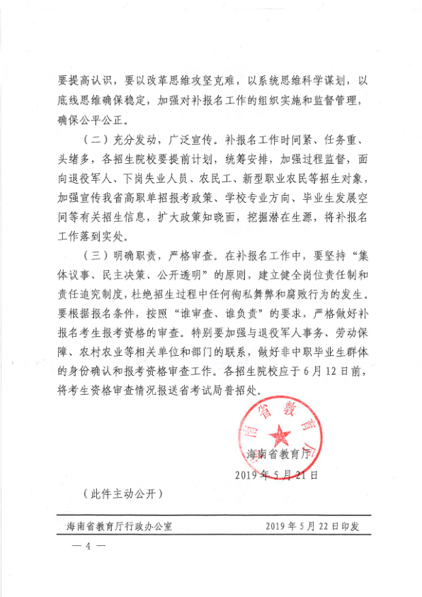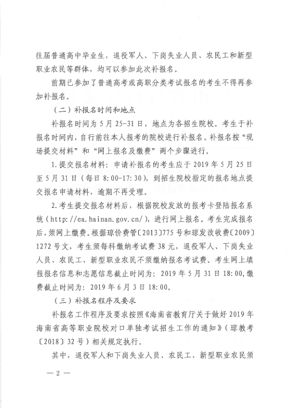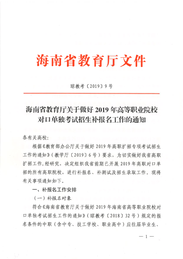 海南省教育厅关于做好2019年高等职业院校对口单招考试招生补报名工作的通知