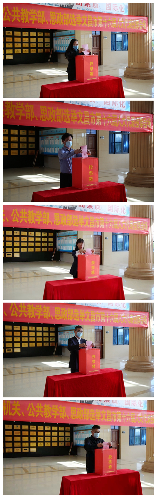 上午9点,我院在综合楼一楼大厅举行文昌市第十六届人大代表学院主会场投票仪式。党委书记佴建乔,党委副书记、院长杨学前,党委副书记黄丽芹,党委委员、纪委书记、省监委驻学院监察专员黄培怡,党委委员、副院长梁松依序进行投票,他们将选民证交给工作人员核验,并领取选票,在写票处认真填写选票,走到票箱前,郑重投下自己的一票。接下来,退休老领导、老同志和其他选民相继投票。各系部选民小组自行前往投票点,学生则由系部书记、辅导员组织带领投票。